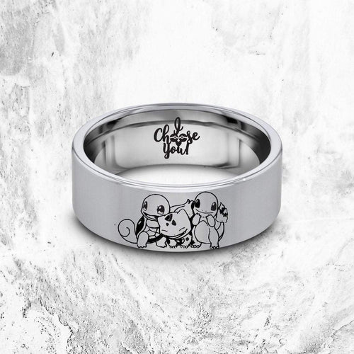 This is an adorable Starter Pokemon wedding band with the unique engraving of "I choose you"