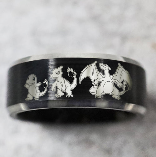This is our starter pokemon ring! The default design consists of the evolution of Charmander to Charmeleon and to Charizard. You can choose any starter pokemon upon request, just let us know!