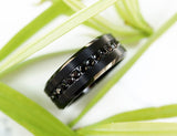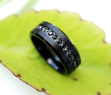 This is a beautiful unique, beveled black diamond ring with a brushed center. The edges of this ring are polished, which create a beautiful contrast against its brushed center. The black diamonds go around the entire center of the ring effortlessly. We can add free custom/personalized engraving can be added to the inside of the ring as well to make this truly special for you or your loved one.