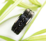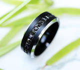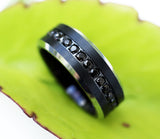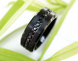 This is a beautiful unique, beveled silver diamond ring with a brushed center. The edges of this ring are polished silver, which create a beautiful contrast against its brushed center. The black diamonds go around the entire center of the ring effortlessly. We can add free custom/personalized engraving can be added to the inside of the ring as well to make this truly special for you or your loved one.