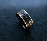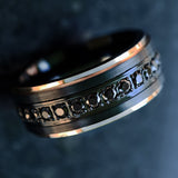 This is a beautiful step edge black diamond ring with a brushed center and rose gold plated edges. Black diamonds go around the entire center of the ring. We can add free custom/personalized engraving can be added to the inside of the ring.