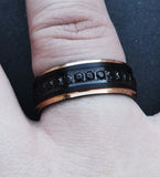 This is a beautiful step edge black diamond ring with a brushed center and rose gold plated edges. Black diamonds go around the entire center of the ring. We can add free custom/personalized engraving can be added to the inside of the ring.