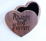 Check out our beautiful one of a kind engraved ring box. All of our boxes are made with 100% real Black Walnut wood and have a soft black velvet inner lining. All wood boxes are unique in grain pattern and can vary in color/appearance from the photo. All engravings are fresh and made to order so there might be a slight engraved wood smell that fades with time.