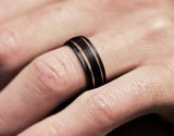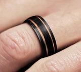 This is a beautiful 8mm men's tungsten carbide groove line wedding band. The domed brushed band has two gold thin groove lines wrapping the entire ring, make the design a minimal yet flawless look.