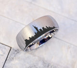 This is a beautiful one of a kind custom engraved New York skyline ring on our domed brushed ring style available in multiple colors. The skyline engraving does not wrap around the entire ring but can be if requested! A truly one of a kind piece you won't find anywhere else.