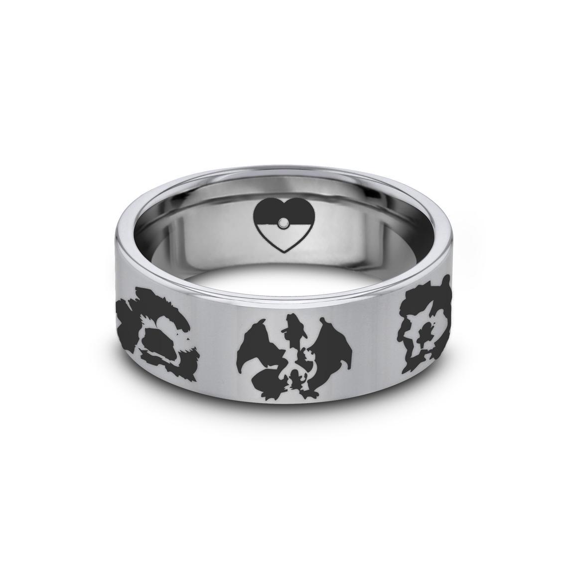 This is an awesome Silver Tungsten Carbide Starter Pokemon Evolution Ring. The design is fully wrapped around the entire ring. We also have the option to engrave the inside of the inner ring as well for a fully personalized ring for your loved one.