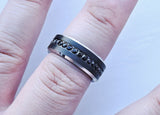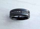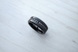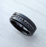 This is our brand new and highly sought after classic black diamond beveled Tungsten Carbide ring. This style was created per request from clients and it's finally here in limited supply! This beautiful ring has a set of black diamonds in the center channel going around the entire band. The diamonds are set into a flat brushed center and are accented with mirror polished beveled edges. This ring is one of our favorites and has a beautiful balance of detail. This is the perfect band for anyone that wants a darker/bolder look!